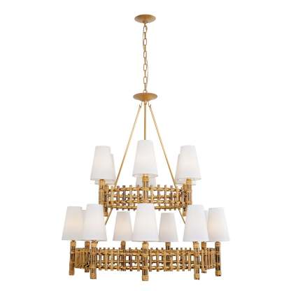 An island in the West Indies, Nevis, derives its name from Spanish meaning, "Our Lady of the Snows." It is a reference to the story of a 4th-century Catholic miracle: a snowfall on the Esquiline Hill in Rome. The image of a miraculous snow-covered peak rising from a hot climate, is the design inspiration behind Nevis by Varaluz. This dichotomy is echoed by pairing white peaked linen shades with natural and sustainable rattan that emulates tropical bamboo, for a modern take on tropical inspired lighting.