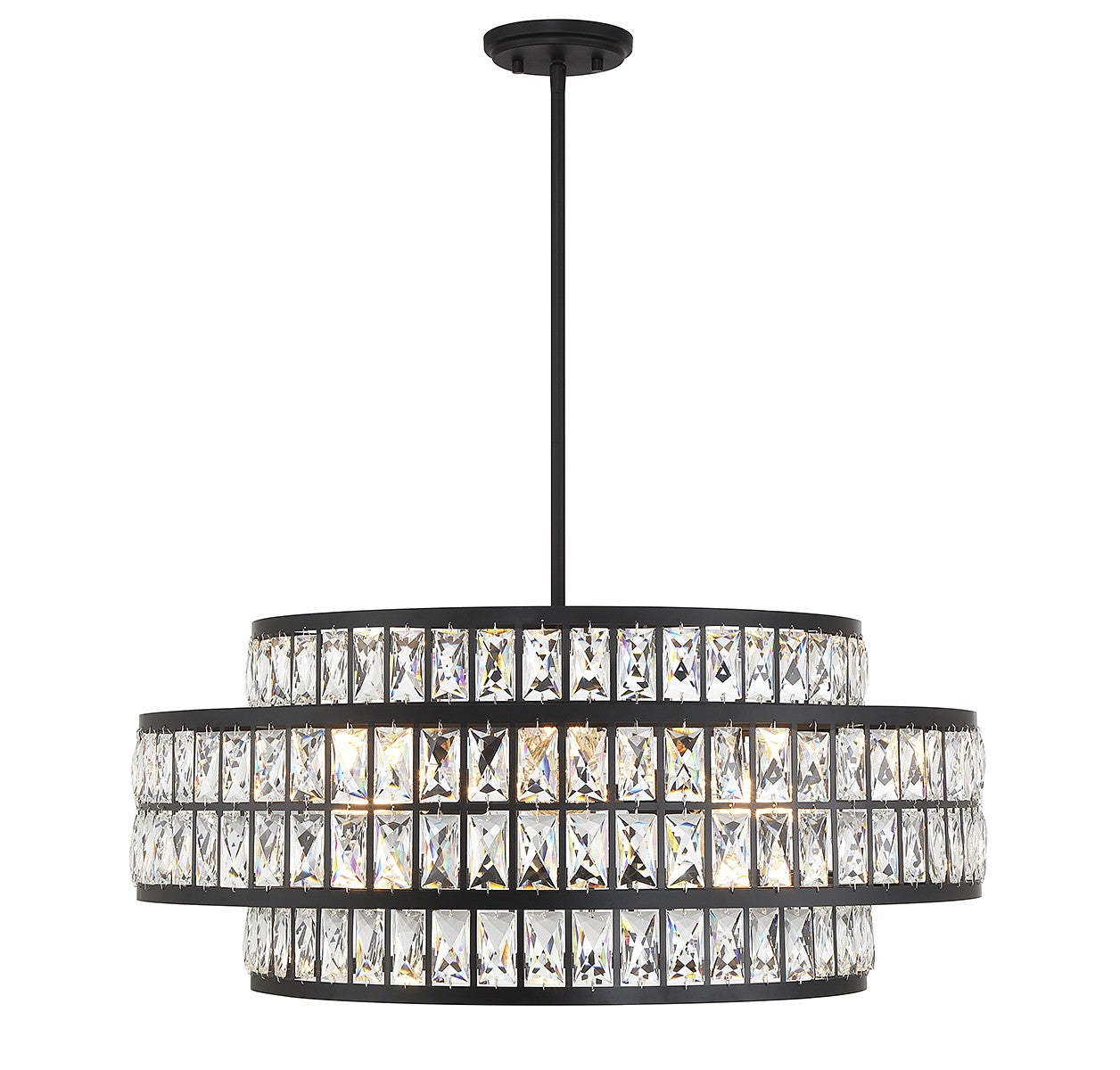 It is often said that lighting is the jewelry of the home and the Savoy House Renzo 6-light pendant is a perfect example of this saying. Faceted clear crystal decorates the two layers of shades, which overlap in an intriguing way and are finished in matte black. Renzo is 28" in width and has an adjustable height ranging from 12.5" to 66". Comes with four 12" downrods and one 6" downrod. It uses 6 standard size bulbs of up to 60 watts per bulb (bulbs not included).