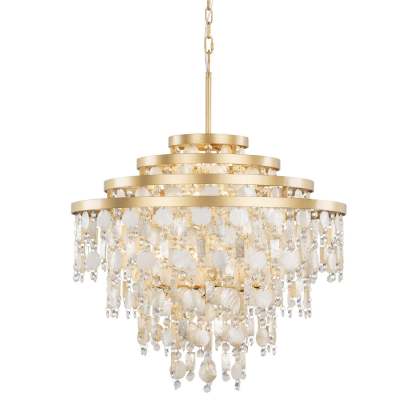 The word Kalani is the Hawaiian word for "of the heavens or sky." To some, it also has noble connotations meaning "royal one." For Varaluz, it is the culmination of a very regal collection of metal work styled in the grand traditions of Venetian glass and crystal chandeliers found in Smithsonian archival holdings. What makes the Kalani collection most striking is that we work in sustainable Capiz and upcycled Kabebe shells (reclaimed after food harvesting) with lead-free crystal to create a warm and inviting take on a glam fixture from days gone by, now reimagined for the modern day.