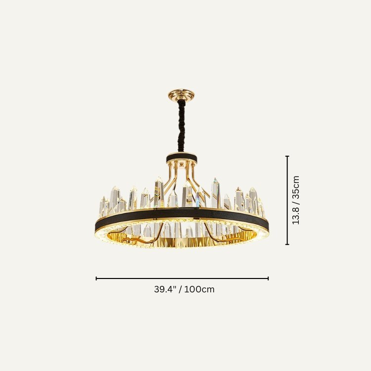 The Alexandra Round Chandelier is a glamorous masterpiece crafted from metal in a radiant gold finish, complemented by chic black leather accents. The uniquely designed crystals, resembling glistening icicles, capture and reflect light, creating a mesmerizing play of brilliance. Enhanced by integrated LEDs, this chandelier transforms any space into a dazzling spectacle, radiating warmth and sophistication.