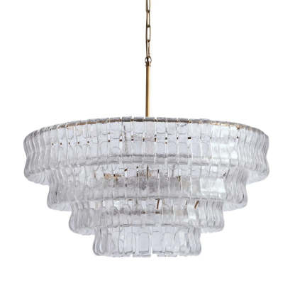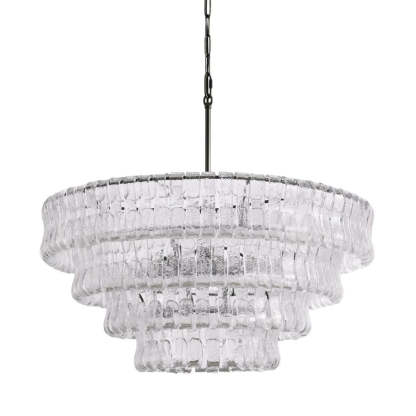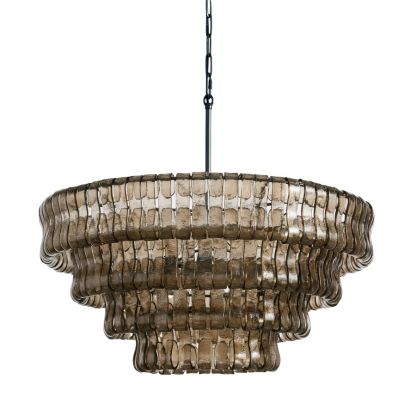Inspired by famously adorned Italian glass, our Amir Chandelier artfully diffuses light through pieces of curved, textured glass. Complemented by a plated-brass finish, Amir elegantly illuminates any room.