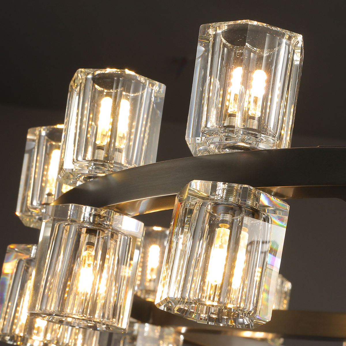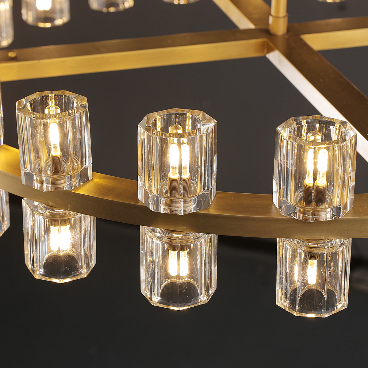 The rhythmic design for this chandelier collection is inspired by the shape and scale of industrial gears, where spokes are interlaced with negative spaces to interlock with other gears. Here, the spokes are hexagonal, juxtaposed with a circular interior made of crystal glass that runs along a simple, sturdy metal frame. The frame is made of solid brass and is available in a lacquered burnished brass or bronze finish, or a polished nickel finish in stainless steel. The lampshade is optically and prismatically made of K9 crystal.
