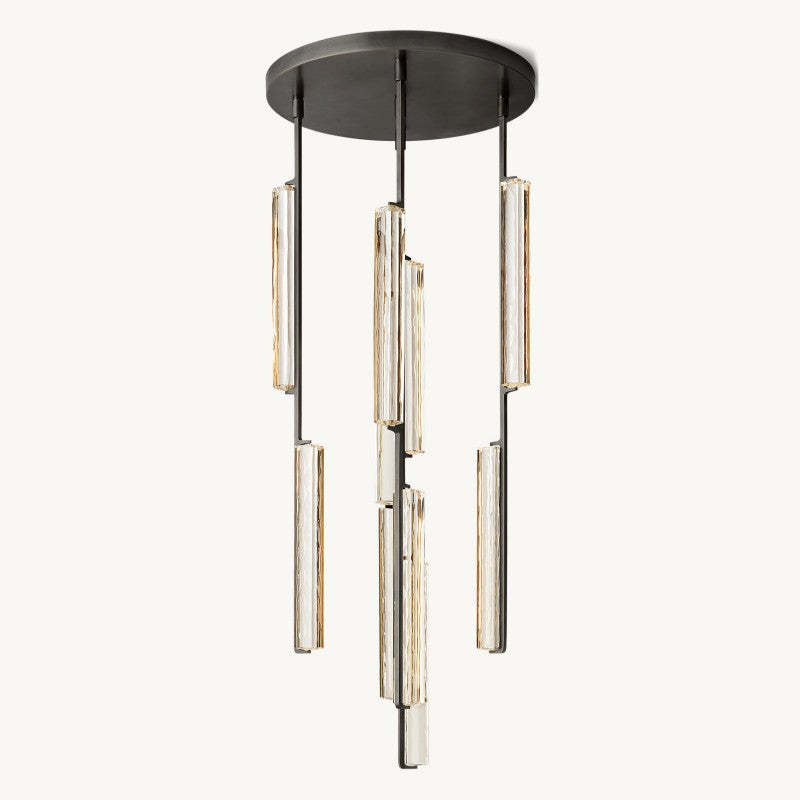 | Capturing the spirit of 1960s Italian minimalism, Audubon appears to cascade from above with ten prisms of hand-polished K9 crystal on vertical brass drops. At once striking and restrained, the collection is the warmth of candlelight with elongated LEDs that shed beautiful light through the undulating texture of the glass. |