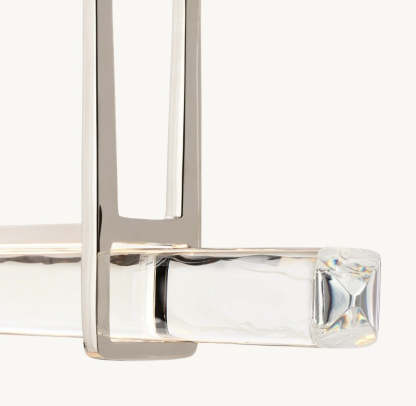 | Capturing the spirit of 1960s Italian minimalism, Audubon appears to cascade from above with ten prisms of hand-polished K9 crystal on vertical brass drops. At once striking and restrained, the collection is the warmth of candlelight with elongated LEDs that shed beautiful light through the undulating texture of the glass. |
