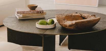 A circular table characterised by its solid textured hammered surface.|The Bowie Coffee Table is captivating with its strong and solid form made of cast aluminum. The hammered texture of this table plays with light and shadow as the bronze coloured finish adds a rich warmth to any interior. The material and texture of this table contribute an industrial flair to the overall design.