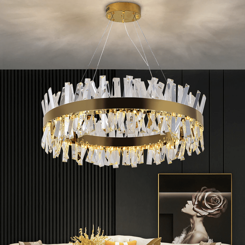 A modern interpretation of classical, the Calvin is a modern chandelier that offers elegant style for modern spaces. Made from stainless steel with a gold finish and handmade clear crystals, this modern chandelier will add a stylish accent to any room with its sleek, yet understated design.