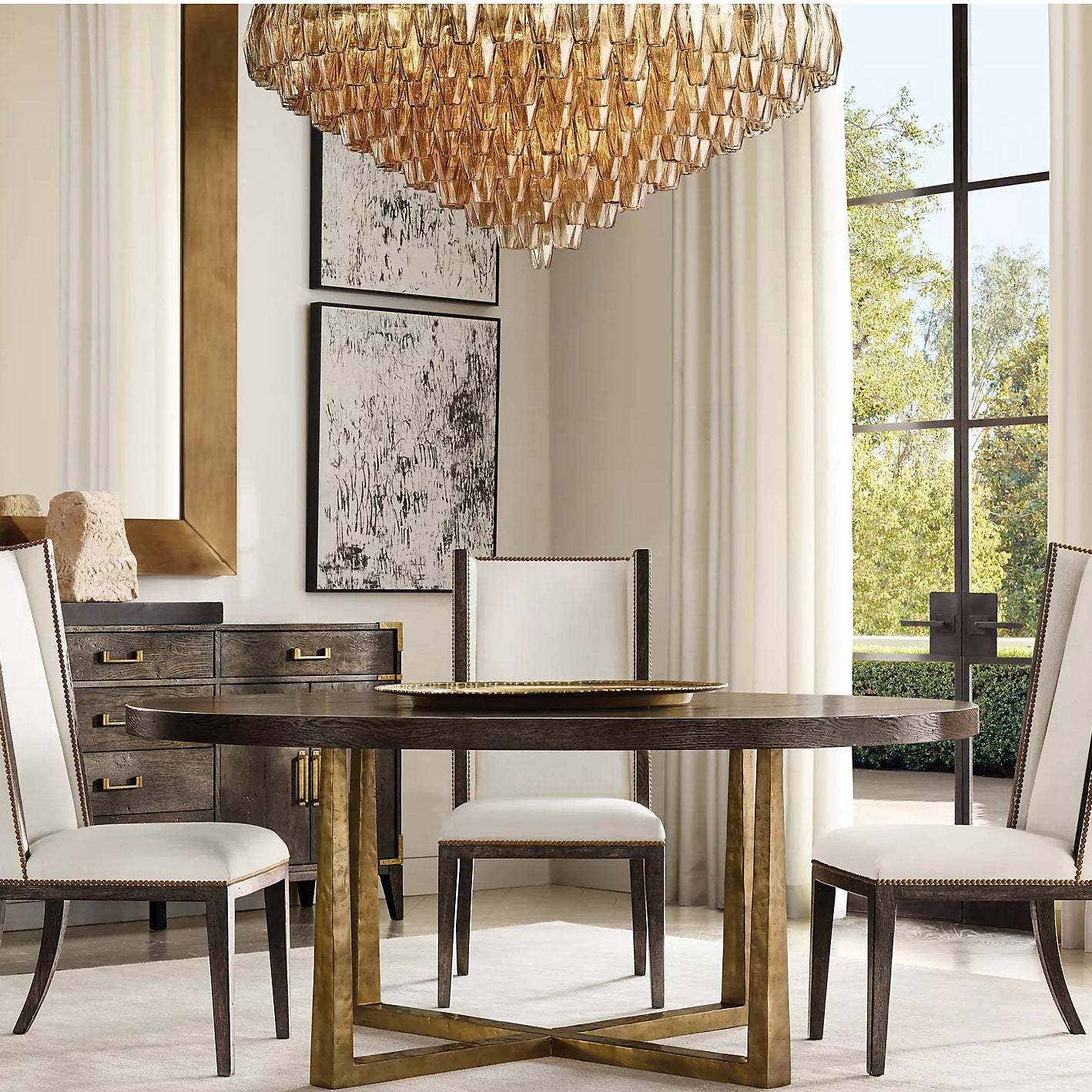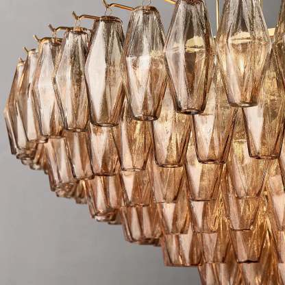 Our fixtures celebrate the minimalist spirit of the period in a grand way. From a cascading steel frame, dozens of hand-blown glass polyhedra hang from individual hooks. Illuminated from within, the faceted chandelier greatly reflects and refracts light.