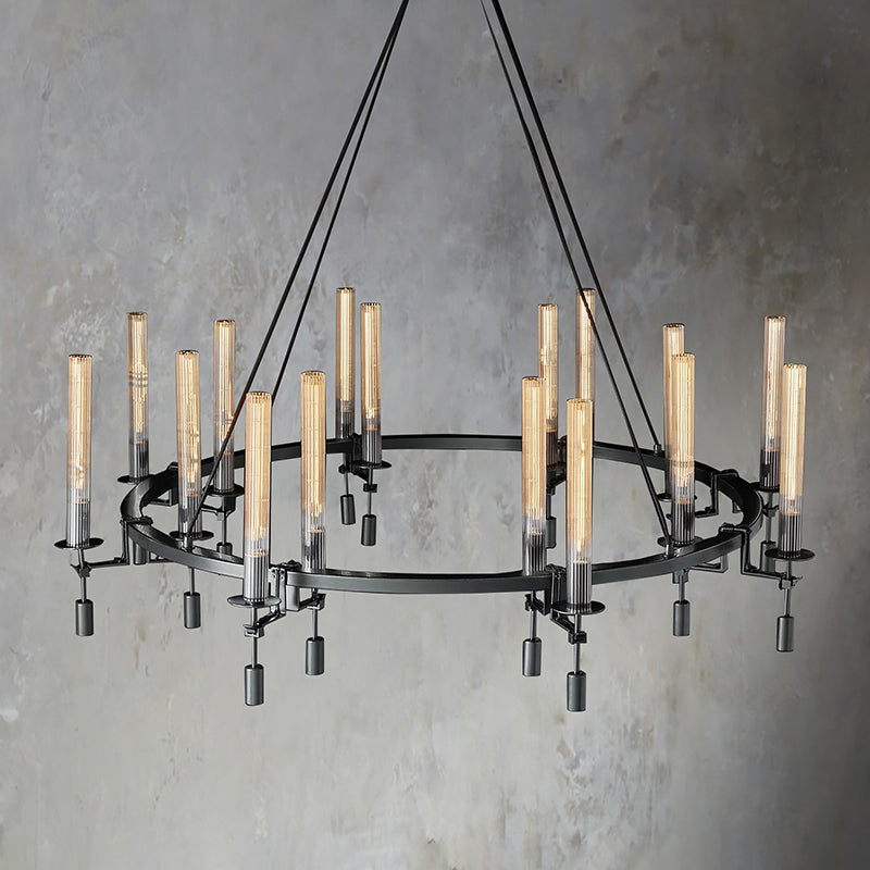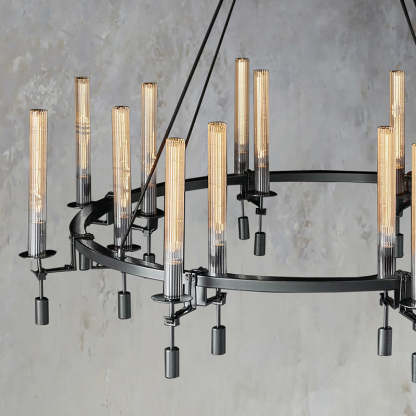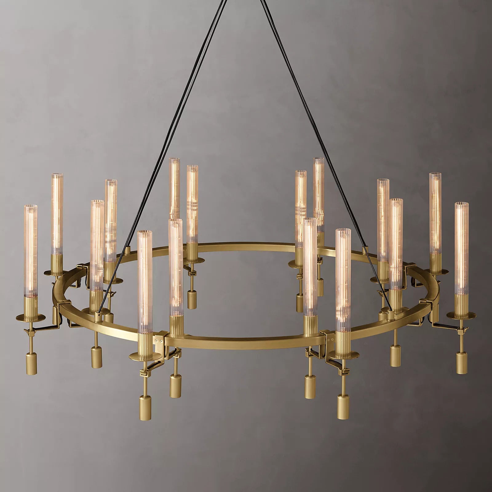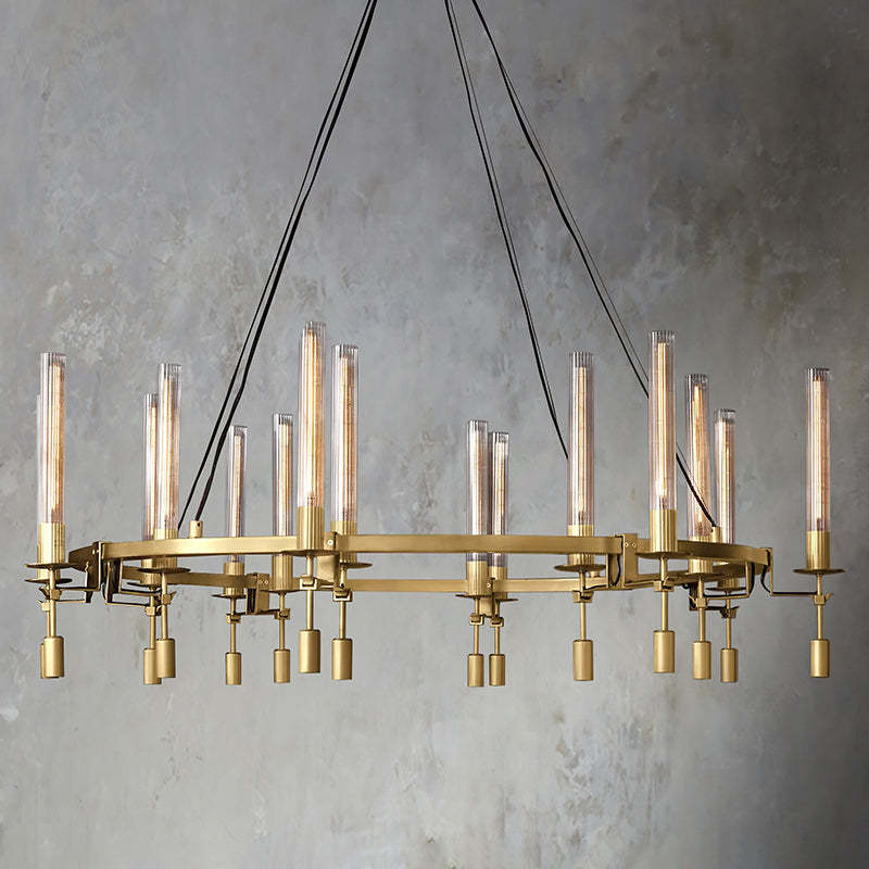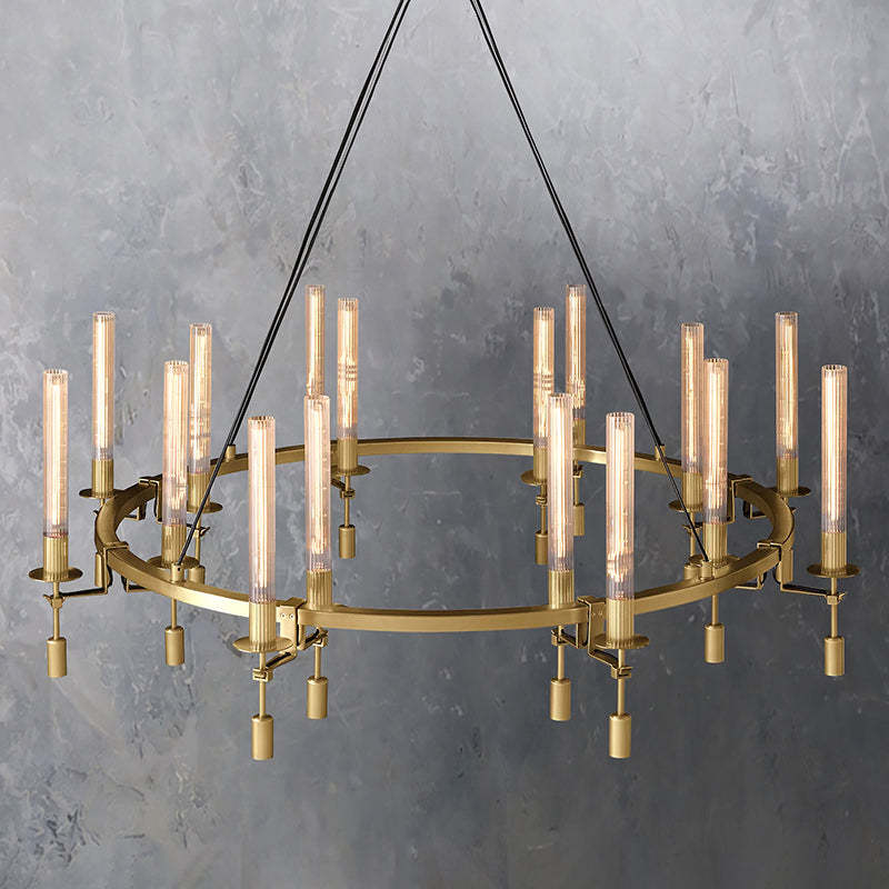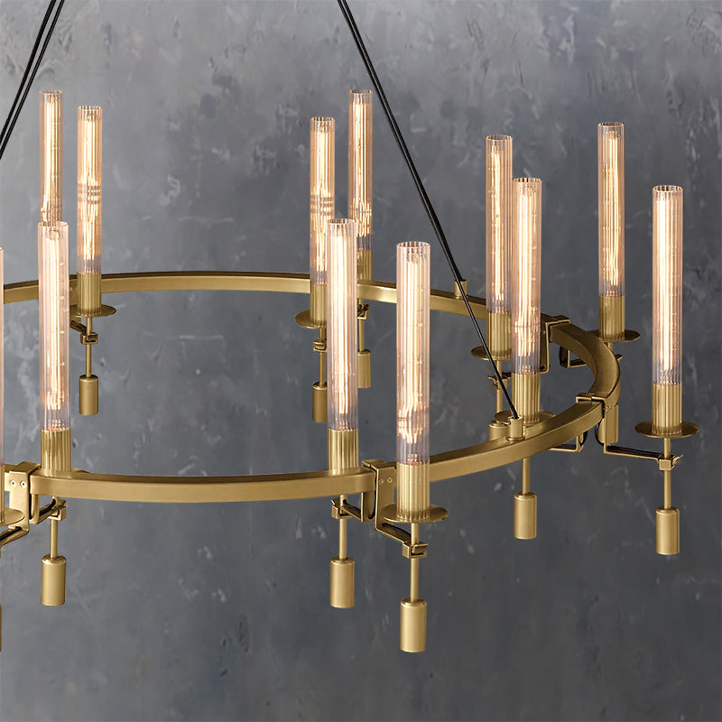 This chandelier is made of solid brass and hurricane made of corrugated borosilicate glass for durability and brilliance. Our fixture evokes French classicism. Made of solid brass, its minimalist construction features an Edison bulb set in cylindrical ribbed glass that shines like a candle.