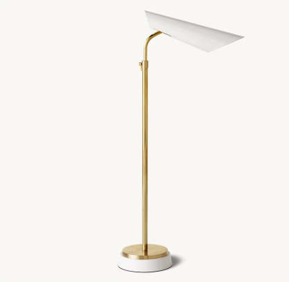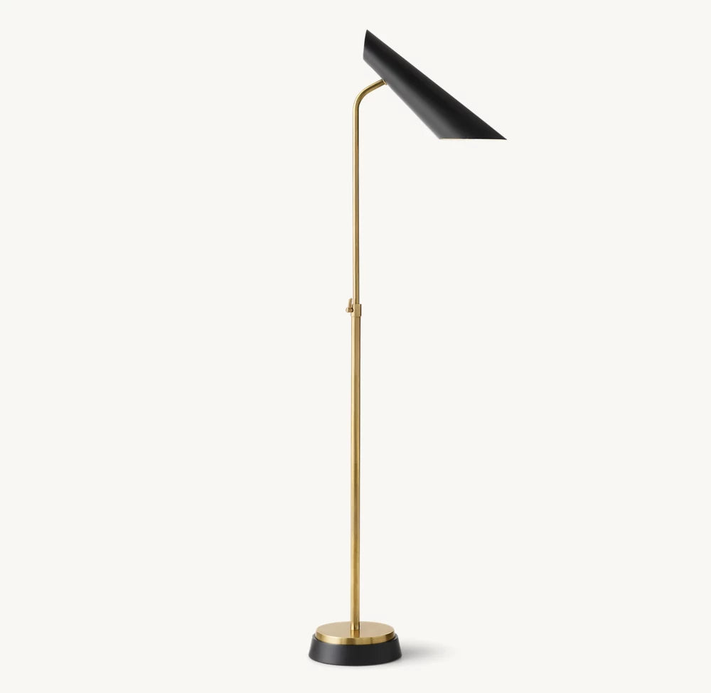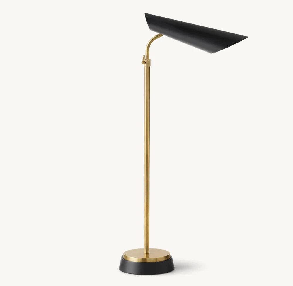 A striking statement piece, Franca by designer Aerin Lauder features a distinctive black metal shade that directs a focused swath of light. The sleek metal base in a hand-rubbed antique brass finish adds refined sophistication.