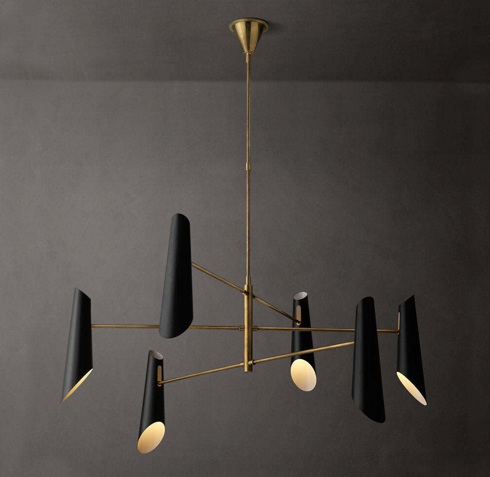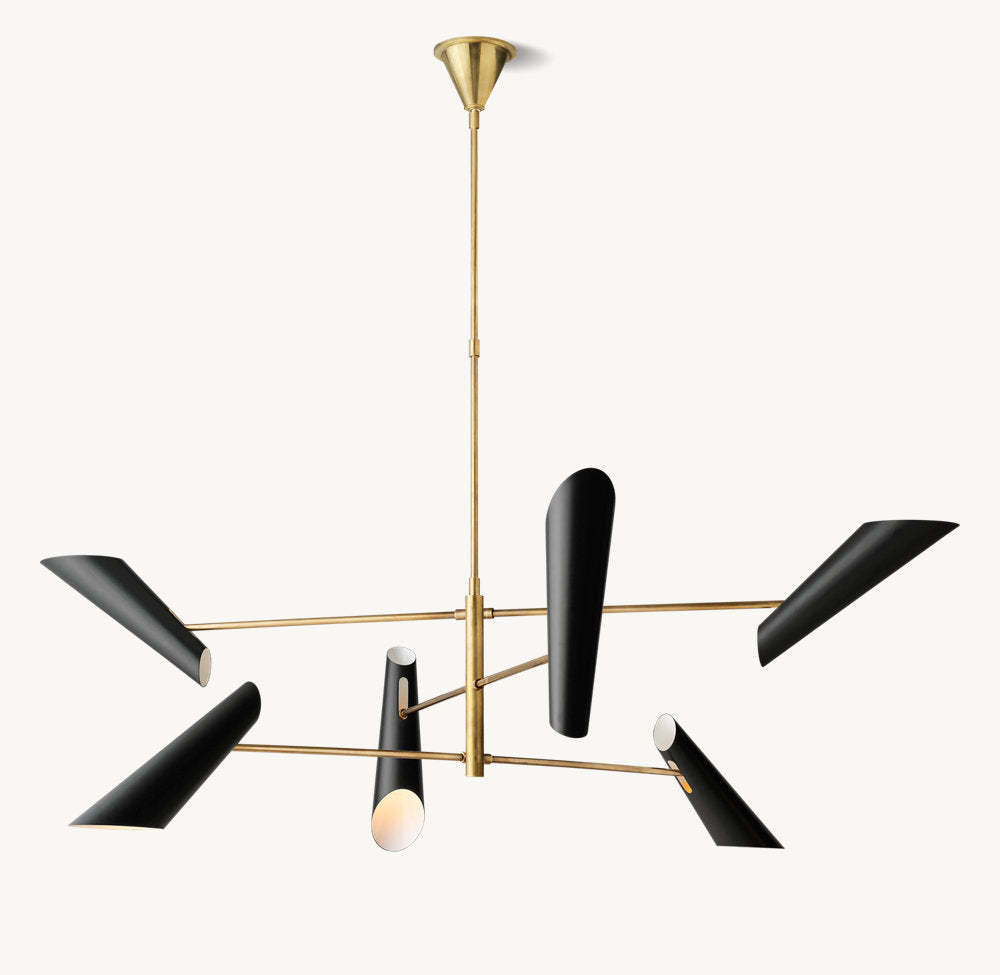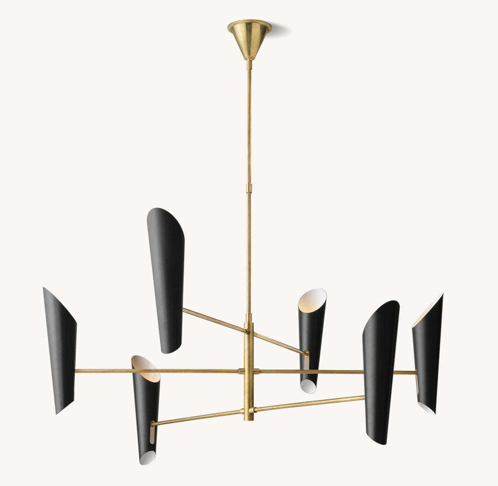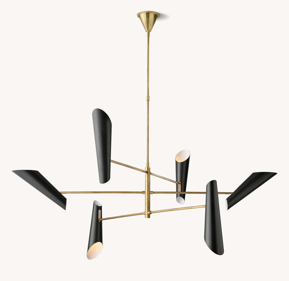 A striking statement piece, Franca by designer Aerin Lauder features an array of four black metal shades that direct swaths of light downward and up to reflect from the ceiling. The sleek, tiered metal frame in a hand-rubbed antique brass finish adds refined sophistication.
