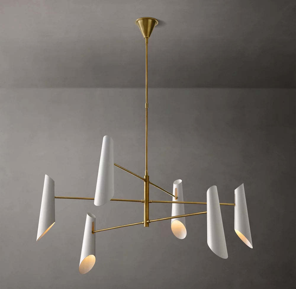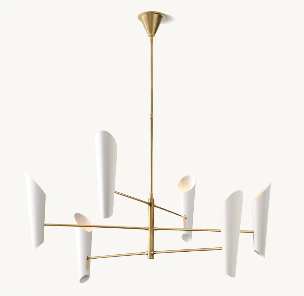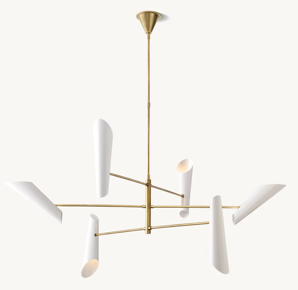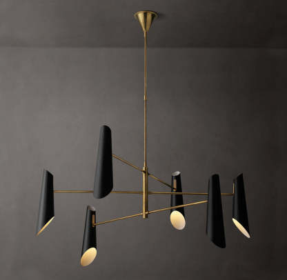 A striking statement piece, Franca by designer Aerin Lauder features an array of four black metal shades that direct swaths of light downward and up to reflect from the ceiling. The sleek, tiered metal frame in a hand-rubbed antique brass finish adds refined sophistication.
