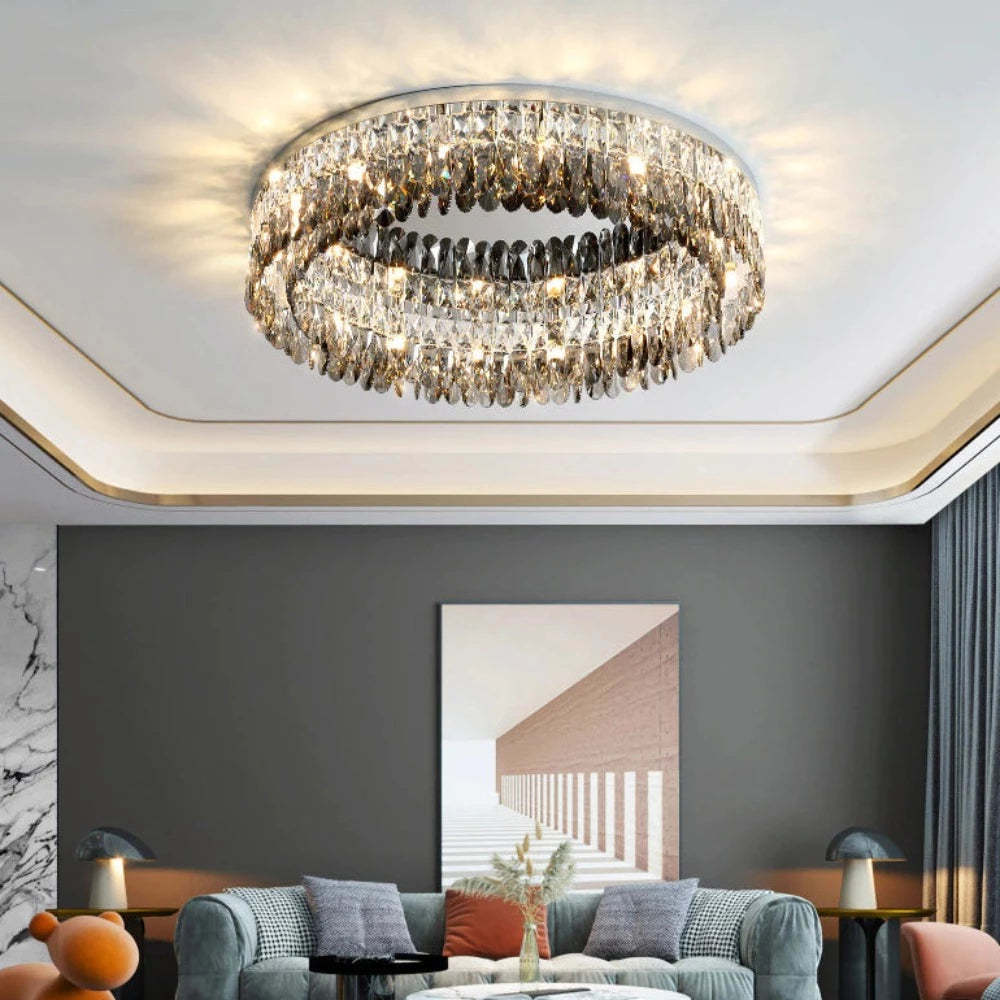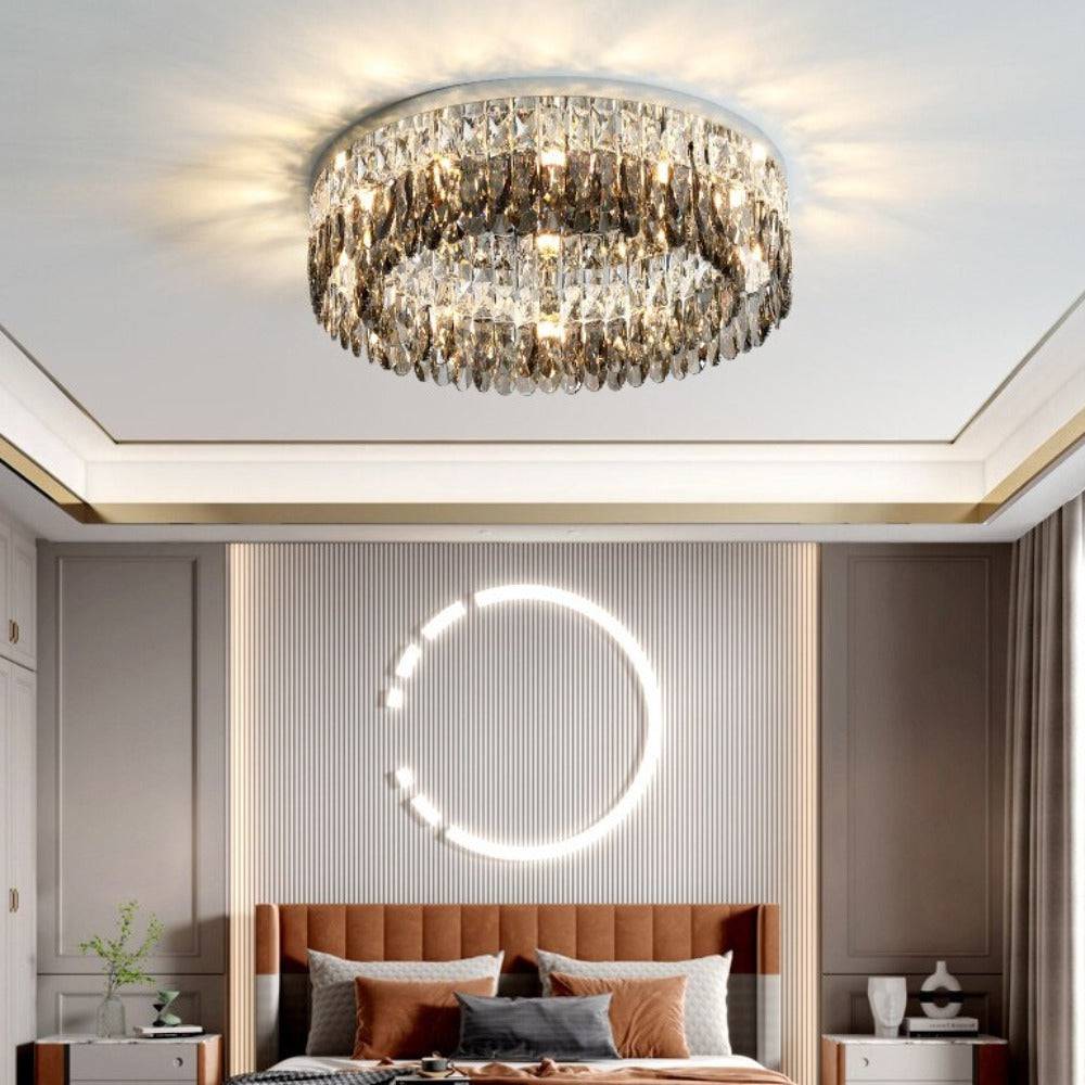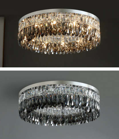 A modern and elegant addition to any room in your home. The Giano flush mount chandelier is the perfect way to add a touch of luxury to any room. Featuring sleek smoke crystals, this chandelier is perfect for low ceilings. With its contemporary design, the Giano flush mount chandelier is sure to be a conversation starter in any room.