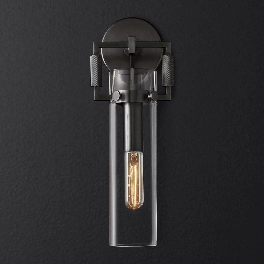 This Wall Sconce is made of crystal and metal, a faceted large crystal glass prism with reflected and refracted light that captures the essence of an emerald cut diamond. The light glistens through the glass.