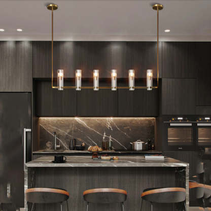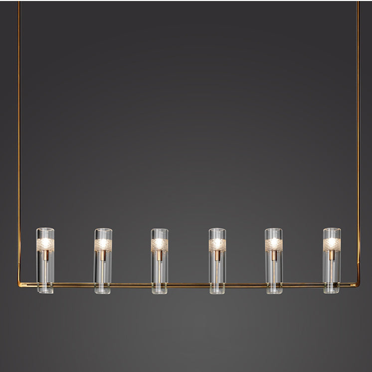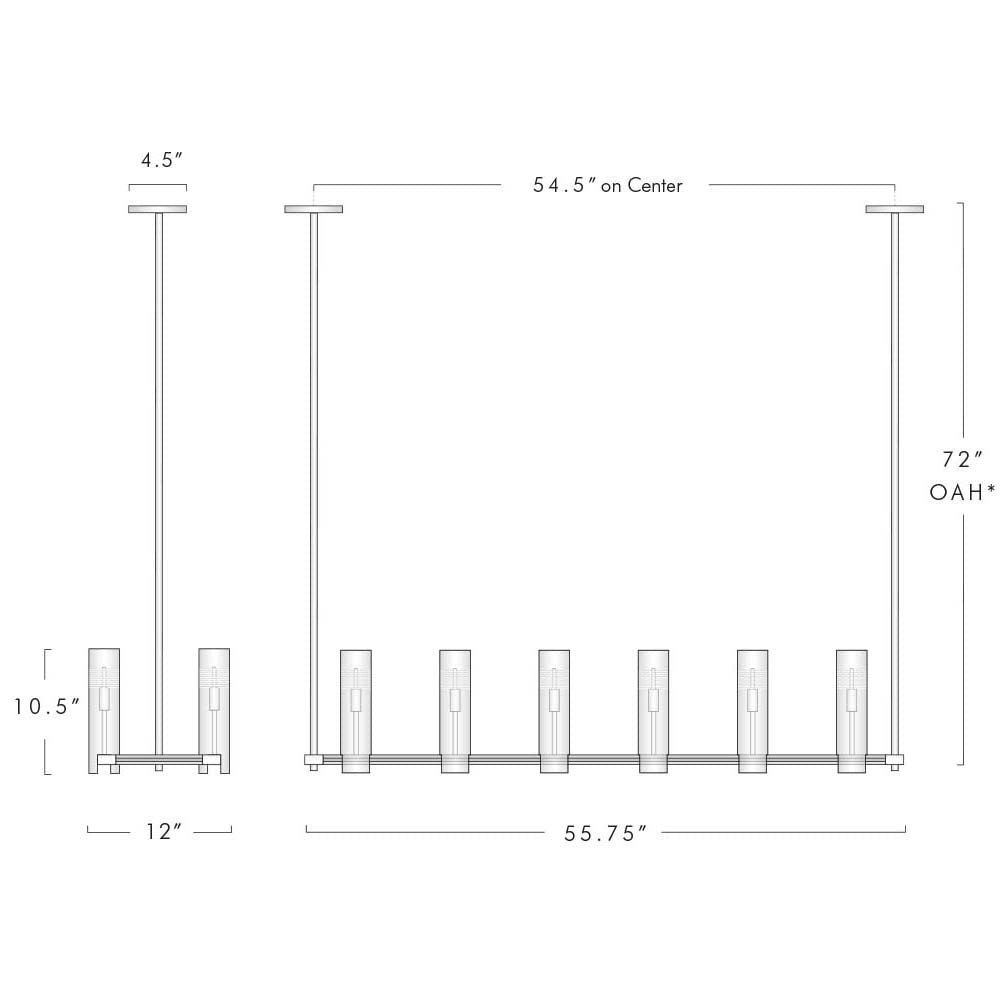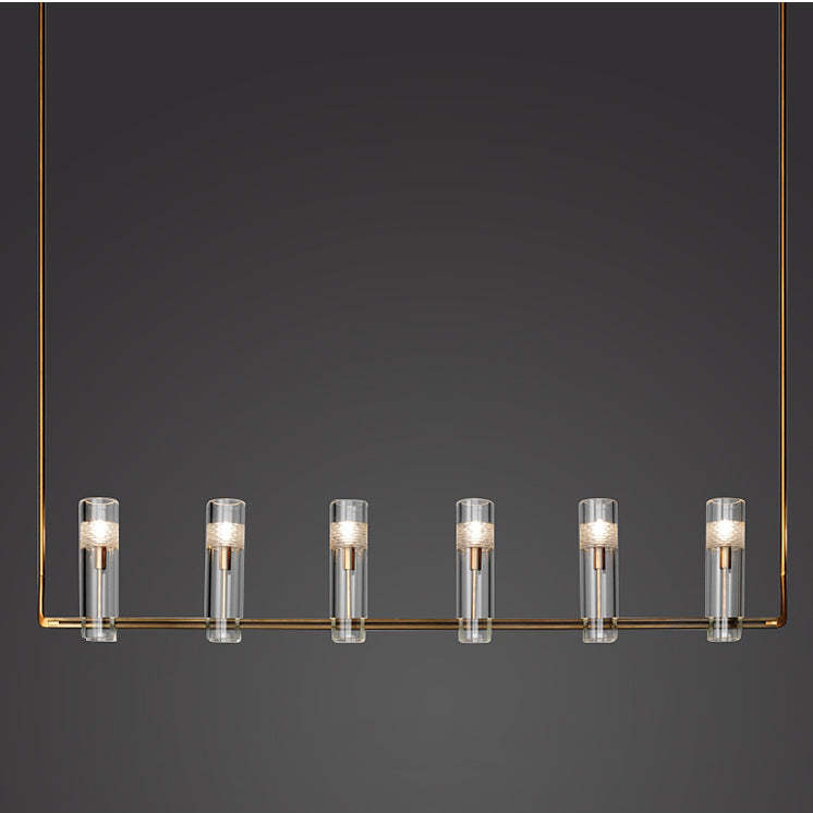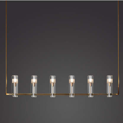| Crystal Tube Linear Chandelier is machined by hand from solid brass. The round rods of the two arms transform seamlessly into its square spine at each corner. Six lead crystal cylinders, with hand carved details, sit along the spine. |