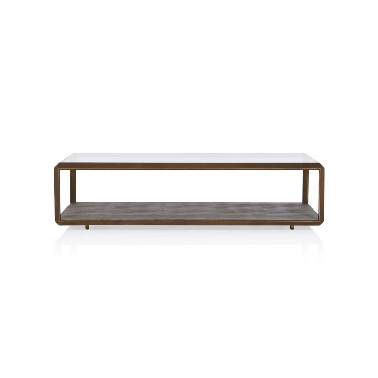 A decorative glass coffee table with versatility finished in a luxe combination of faux shagreen polished stainless steel and glass.|The perfect piece for adding a touch of glamour and function to your living room the Max Glass Coffee Table is ideally proportioned. The open design and reflective persona allow light and space to surround. Featuring an angular metal frame with slender silhouette finished in antique brass accented by faux shagreen it is sure to amp the glam factor in any room.