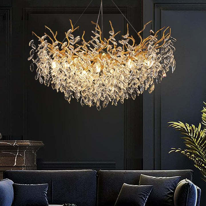 | Crystal Branch Round Chandelier Gold is made of metal and crystal , The brass branches are all twisted and shaped by hand, to form a natural and organic look, decorated by the beautiful little coin shape glass. this serip inspired design is very suitable for the dining and kitchen area. |