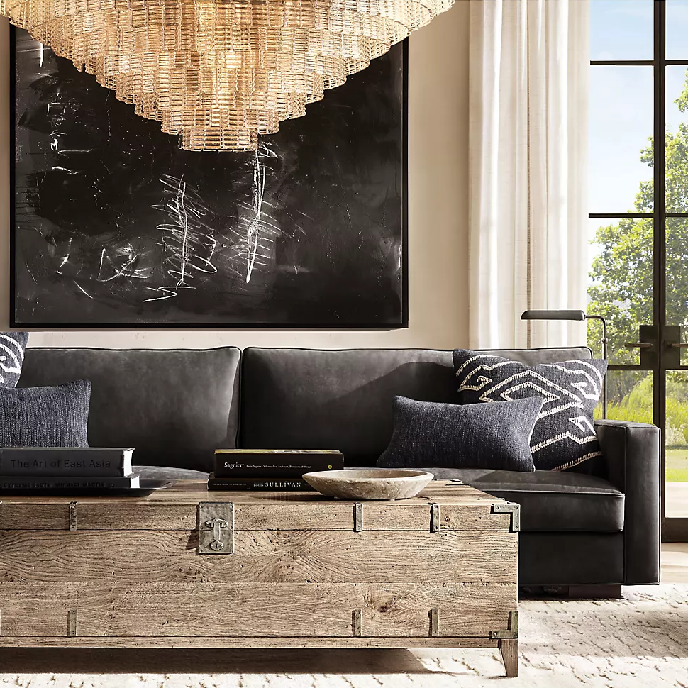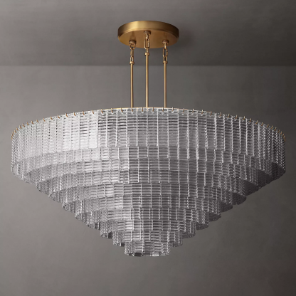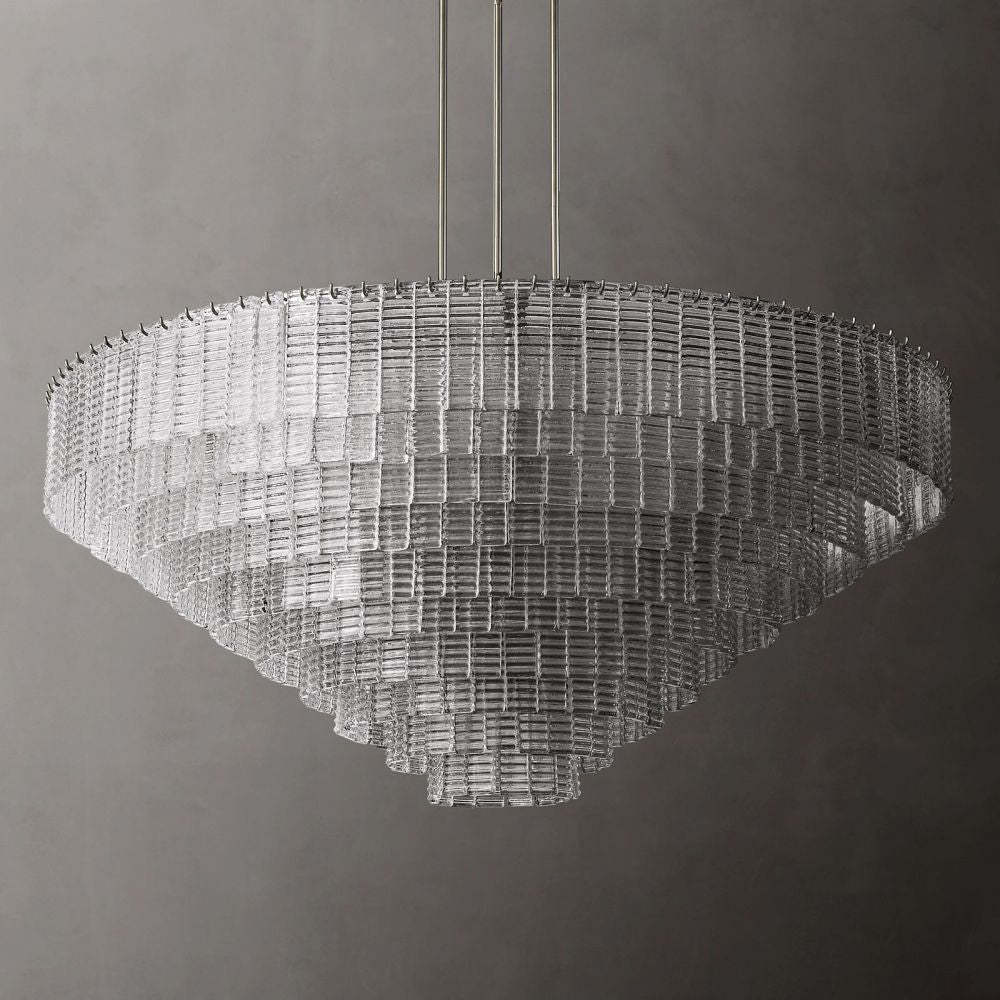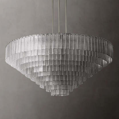 Our chandelier combines traditional glassmaking techniques with modernist style. A study in geometric repetition, the textured cast glass ribbons cascade in concentric circles, casting a warm glow to stunning effect.