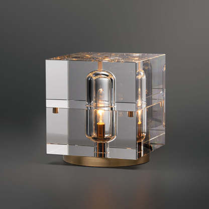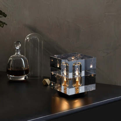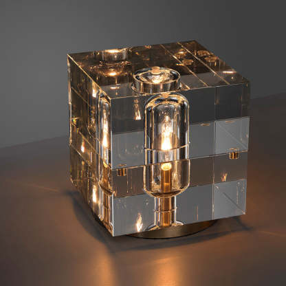| Modern Square Crystal Table Lamp is machined from solid brass. All parts are hand polished and patina'd. Each lead crystal half is hand carved and polished, held in place by 4 individual brass pins. |